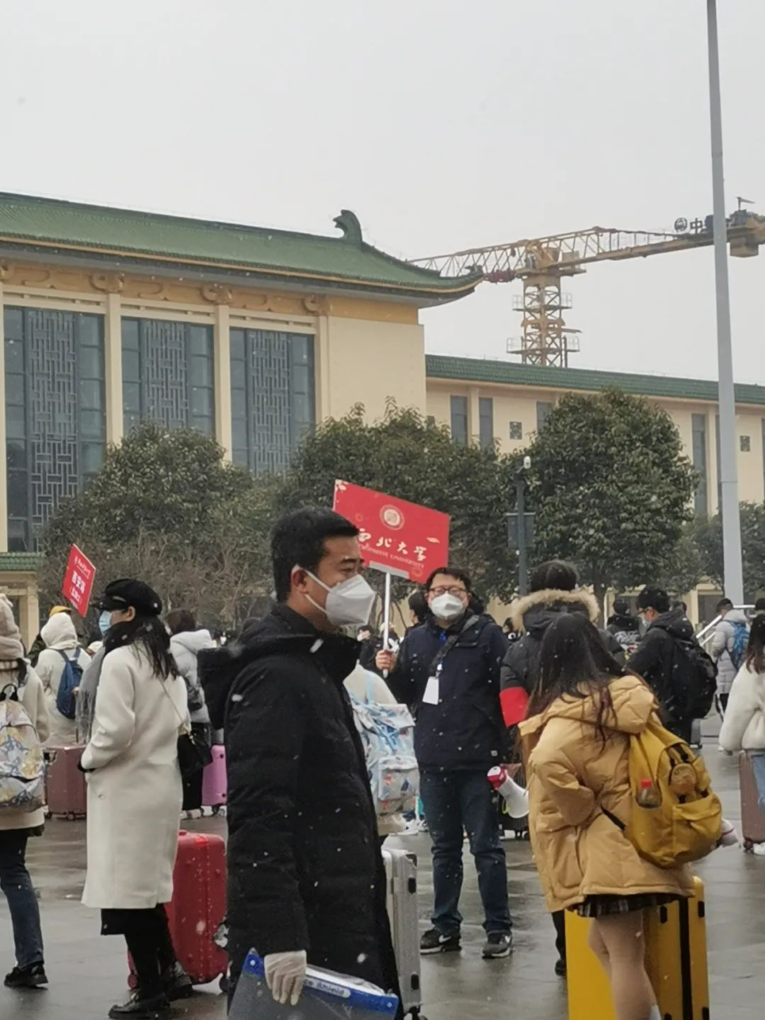寒风凛冽,雪花飘飞。未曾预料的寒冷天气无疑给陈露老师的工作增添了难度。陈老师的工作地点是在学生下车点与火车站进站口之间,露天的大广场上没有任何遮挡物,陈老师只能通过跺脚、跑步的方式来取暖,以求以更饱满的精力投入到对接学生的任务当中。