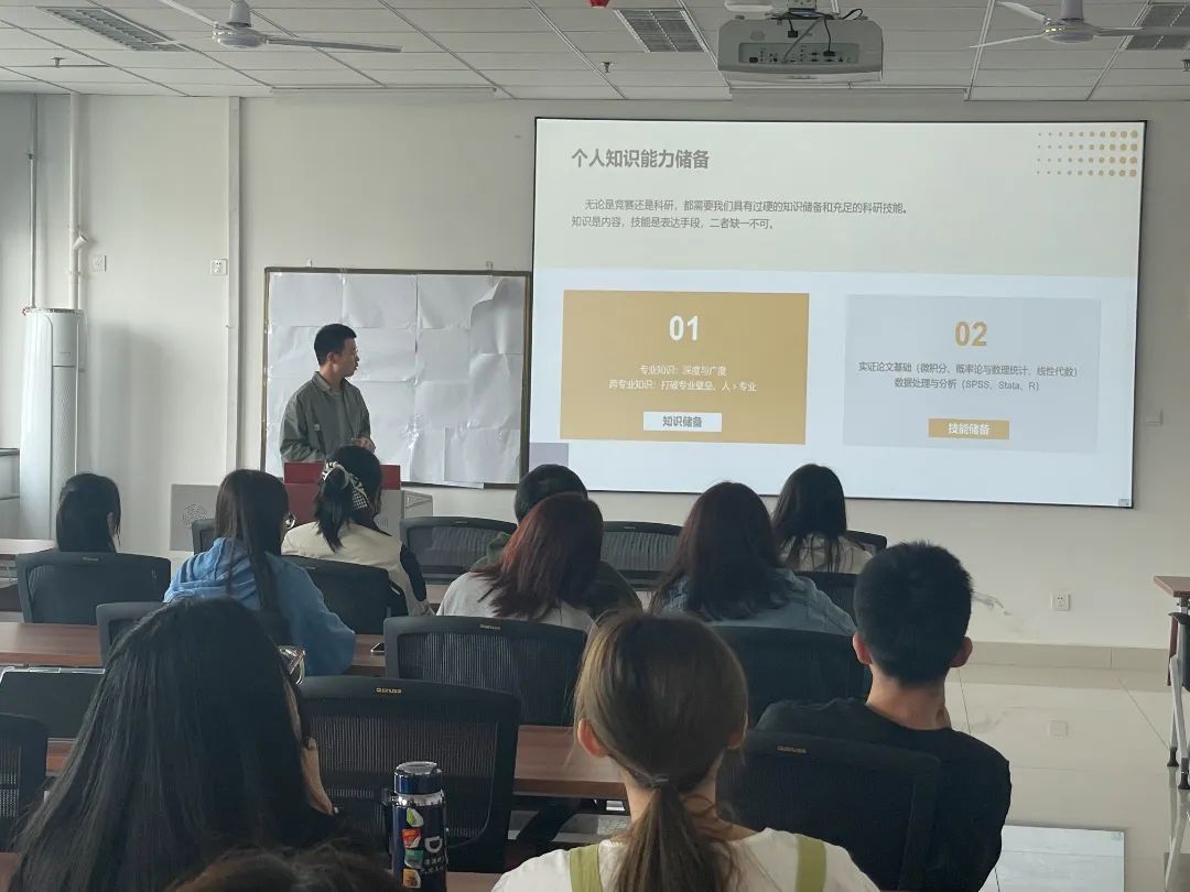 接下来,2021级劳动与社会保障专业本科生陈钟坝为大家分享了他的参赛经验。他从个人知识能力储备、项目选择、具体过程与大赛内容、成长与结果四个方面展开分享,提倡大家在扎实专业知识的同时学习跨专业知识和数据处理与分析方法,扩充个人的知识储备,打破学科壁垒。