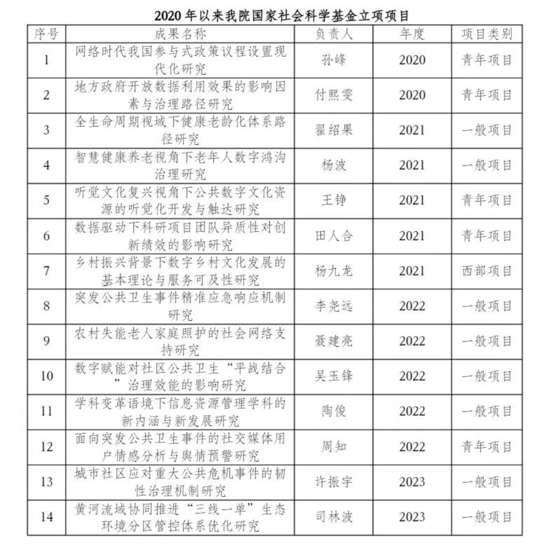 日前,全国哲学社会科学工作办公室公布了2023年国家社科基金年度项目、青年项目和西部项目立项结果,我院共立项2项国家社科一般项目。此外,2023年度我院还立项2项教育部项目。2020年以来,我院国社科、国自科、教育部项目共立项26项(国家社科14项,国家自科4项,教育部项目8项),在国家级项目申报及立项中成果丰硕。未来,学院将围绕重大理论和社会现实问题,以学科平台为载体,遵循“精基础,强应用,育交叉,促转化”方针,不断突出研究优势和特色,以学科交叉融合方式推动研究范式创新,全面提升学院学科整体实力和服务社会发展能力,为国家发展和区域振兴提供科研保障。