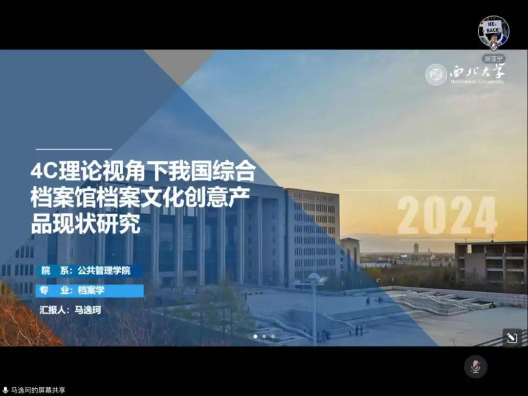 2021级档案学专业研究生马逸珂汇报的论文题目是《4C理论视角下我国综合档案馆档案文化创意产品现状研究》,主要从网络调研、专家访谈及问卷调查的数据中分析总结出当前档案文化创意产品开发与推广的现状,并进一步总结面临的问题及产生问题的原因,最后基于4C理论提出具体的解决策略。