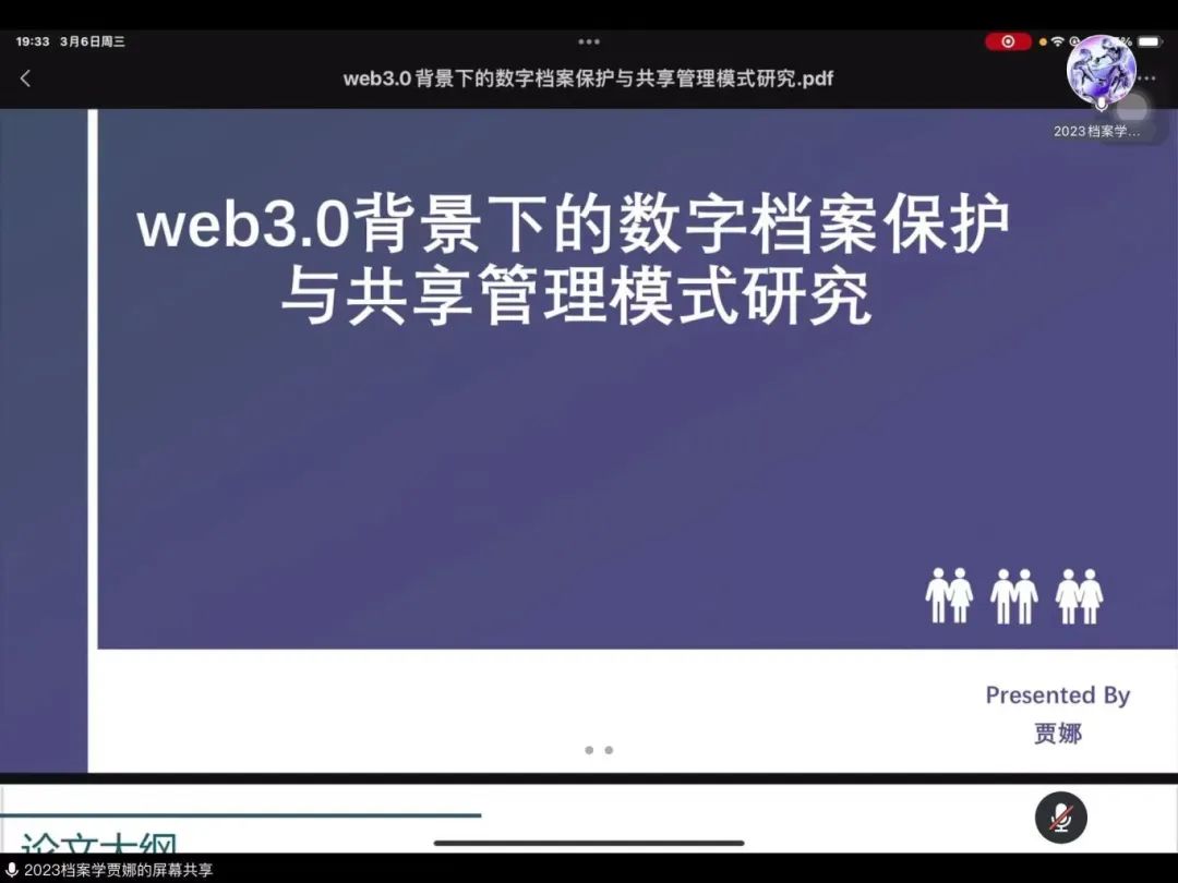 2023级档案学专业研究生贾娜汇报的题目是《web3.0背景下的数字档案保护与共享管理模式研究》,随着互联网技术的飞速发展,web3.0成为当前新的技术热点,针对现有电子档案管理中普遍存在的数据中心化存储、安全性差和防篡改性弱且共享利用率低等问题,提出一种基于web3.0的新规则,以区块链为底层技术的电子档案保护与共享方法:通过智能合约和数字签名的结合,实现对用户进行身份认证的功能;通过智能合约和星际文件系统(IPFS)等技术,实现对档案数据的保护、利用和共享;通过联盟链和公有区块链相结合的方法,实现对档案数据的去中心化存储,提高档案数据保存的安全性以及档案内容信息的原始性。希望在档案数据保护与共享利用领域,提供web3.0技术应用的新模式,促进档案馆或是公司档案部门进一步发挥档案的价值。