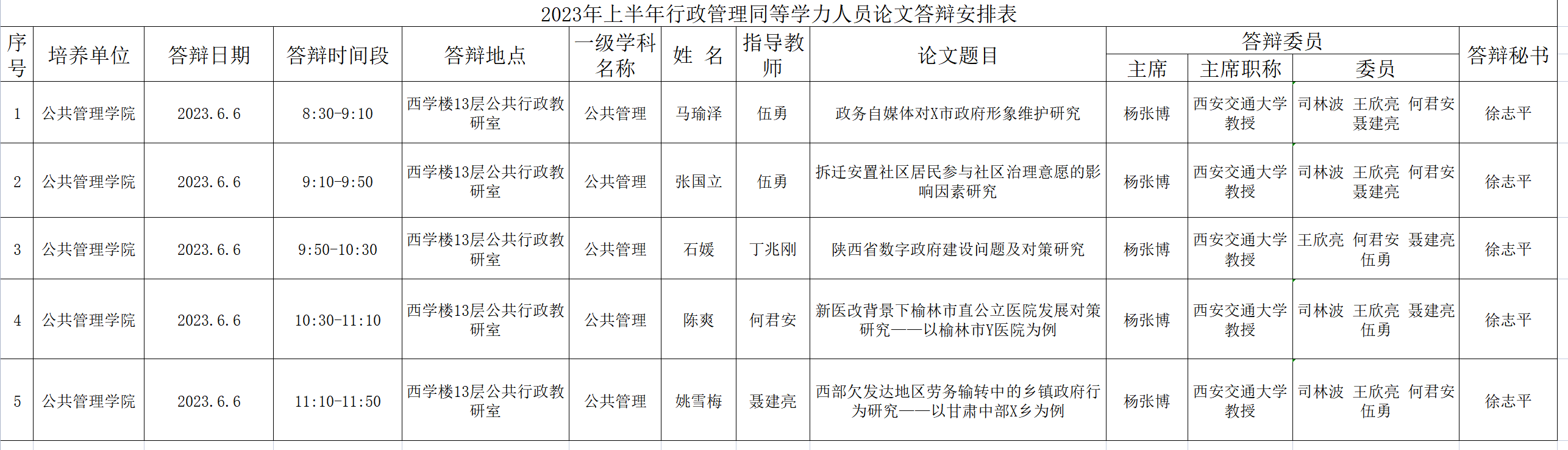 2023年上半年行政管理同等学力人员论文答辩安排表