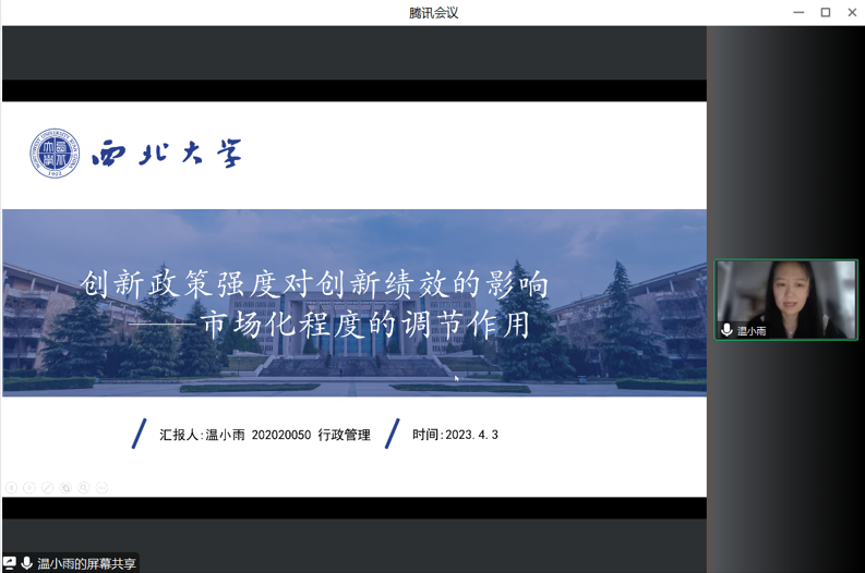 2020级行政管理专业硕士研究生温小雨同学的汇报题目为《创新政策强度对创新绩效的影响─市场化程度的调节作用》。该研究对创新政策强度影响创新绩效的作用机制进行了深入探究,并且结合中国转型经济时期的特殊制度背景,探讨市场化程度对政府创新政策强度与创新绩效的调节效应。