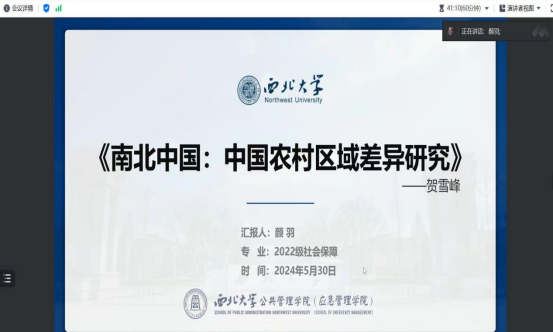 2022级社会保障专业硕士研究生颜羽同学分享的书目是贺雪峰所著的《南北中国:中国农村区域差异研究》。分享内容围绕作者简介、书籍简介、主要内容、阅读启发展开,从村庄社会结构出发介绍南北中三种类型村庄,在此基础上形成中国农村研究的中层理论,最后提出乡村治理正是在不同的村庄结构上进行的,研究村庄结构及相关各项政策、制度落地的实践,就是要研究乡村治理的社会基础。
