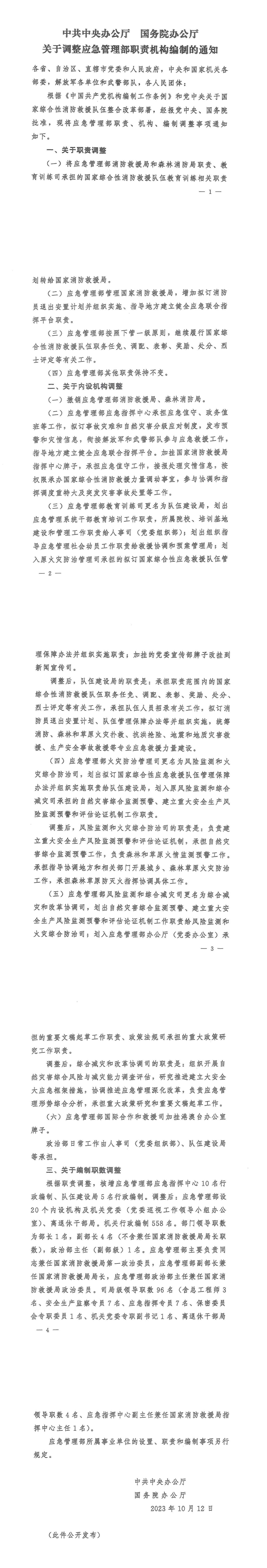 根据《中国共产党机构编制工作条例》和党中央关于国家综合性消防救援队伍整合改革部暑,经报党中央、国务院批准,现将应急管理部职责、机构、编制调整事项通知如下。